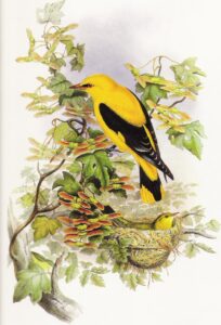 La oropéndola, oriolus oriolus, es un hermosísimo pájaro difícil de ver pero fácil de oír. Es difícil de ver porque suele volar por la parte alta de los árboles de ribera como chopos y fresnos, pero su canto es inconfundible, un silbido melodioso que penetra en el oído y cerebro humanos sugiriendo que quiere hablar con nosotros. Es ave de paso, en el invierno no está. Una vez le preguntamos a un agricultor cuándo empezaba a escucharse su canto y nos respondió «en el tiempo de las cerezas». Buena respuesta: hacia mitad de mayo comienzan a cogerse las cerezas y, quizás, no lo sabemos, si el fruto viene tardío por el mal tiempo el ave también retrasará su llegada.